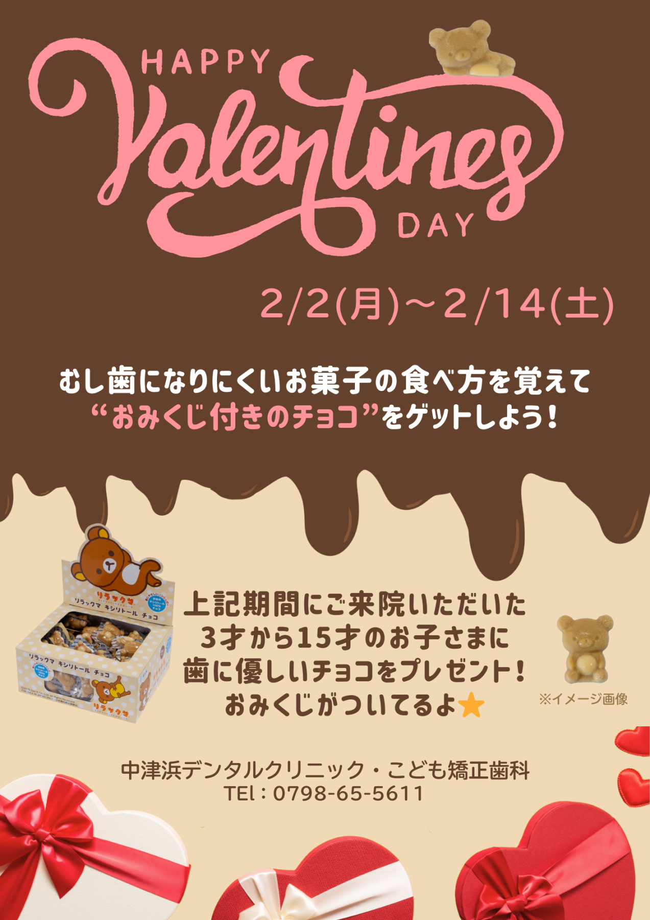 期間中にご来院いただいた3才~15才のお子さまを対象に、歯にやさしい「おみくじ付きチョコ」をプレゼント♩